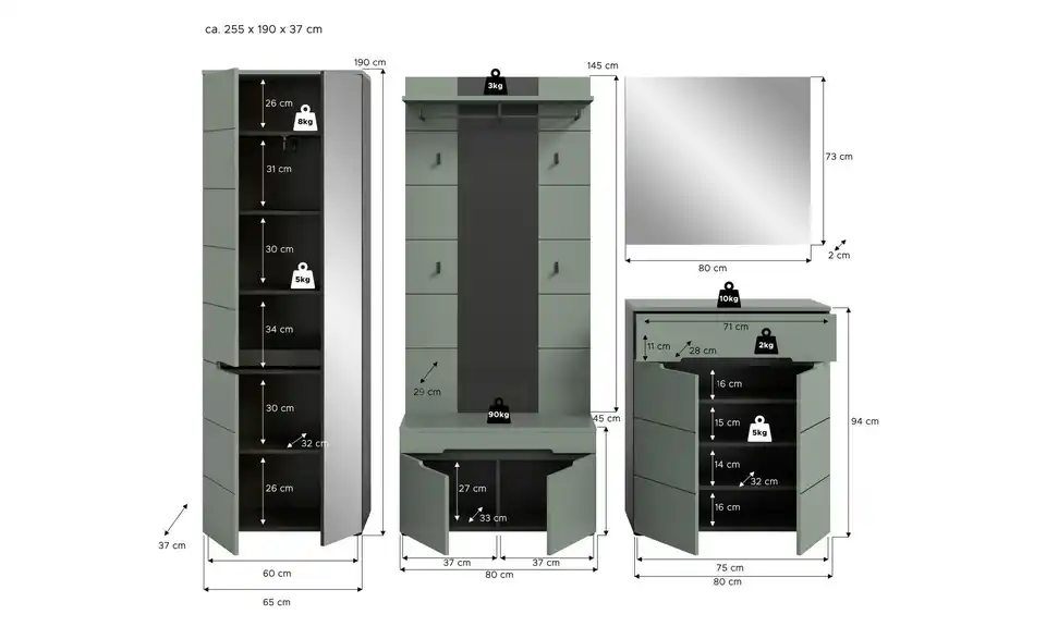 - max. Belastbarkeit je Schubkasten bis ca.2 kg