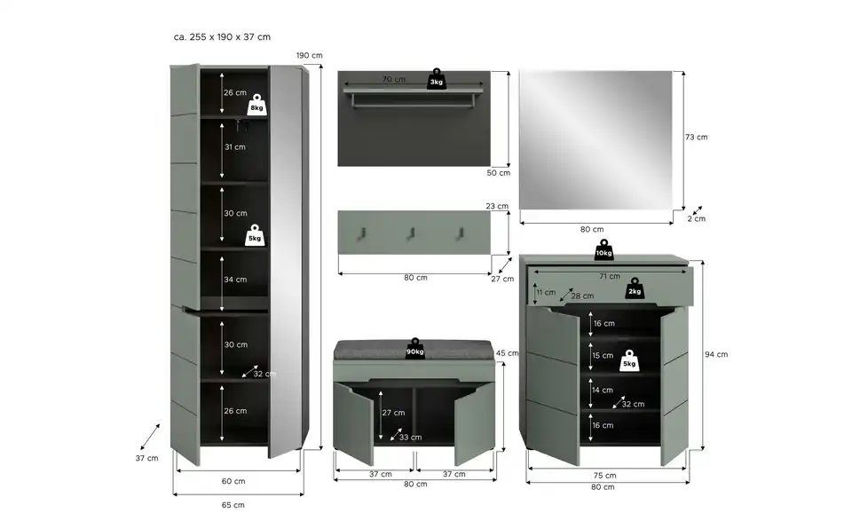 - max. Belastbarkeit je Schubkasten bis ca.2 kg