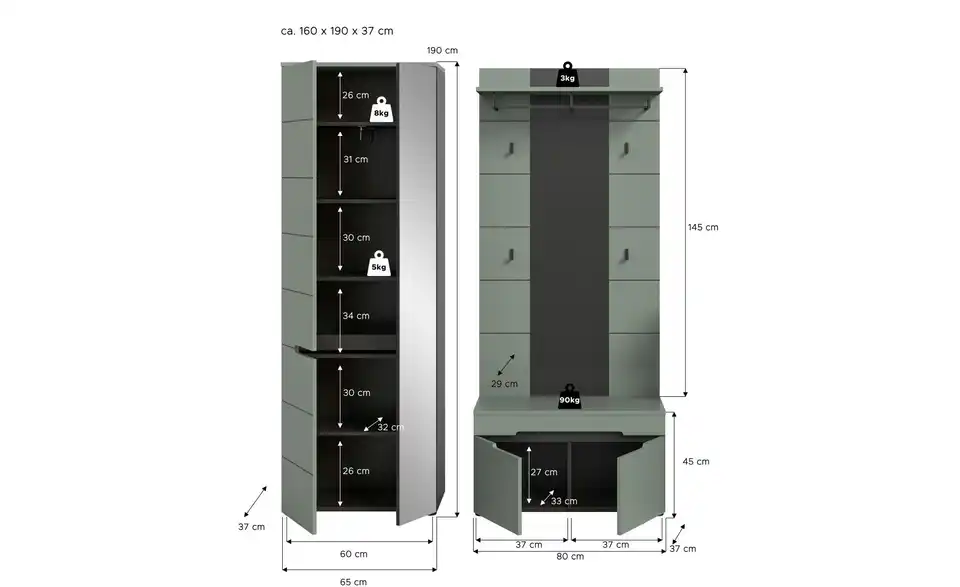 - max. Belastbarkeit je verstellbarem Einlegeboden bis ca.5 kg