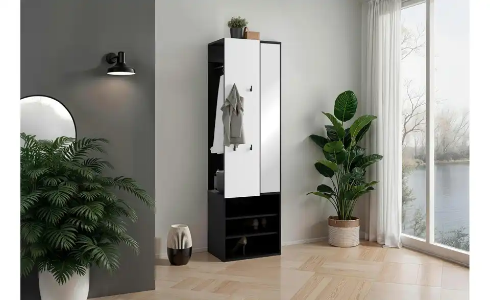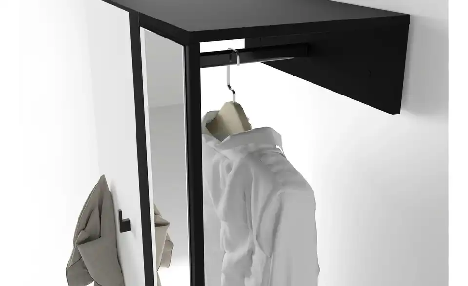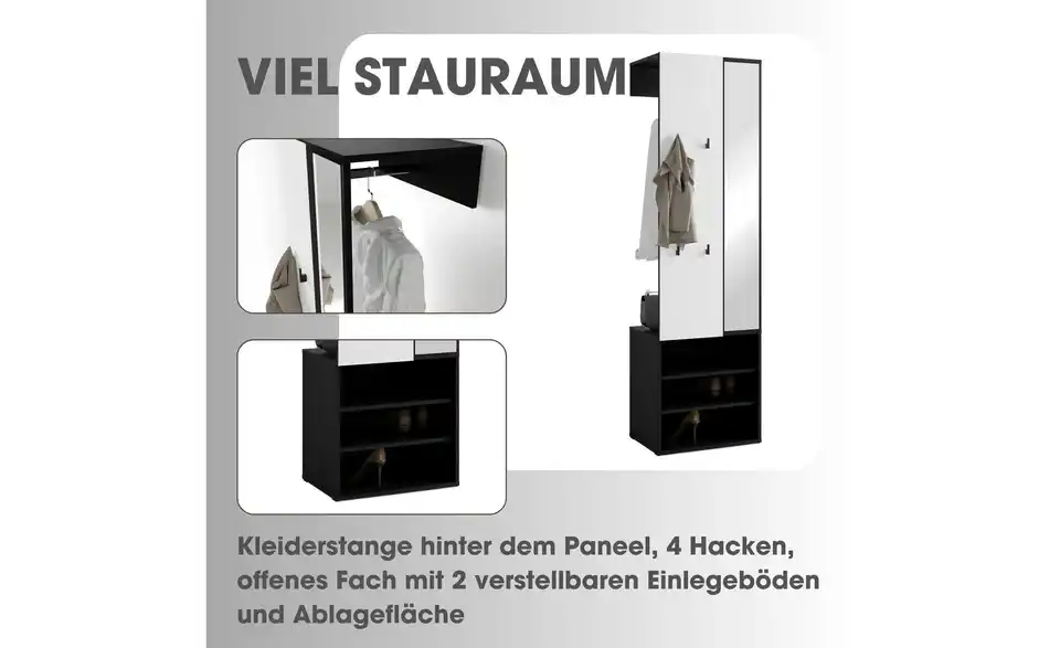 - Mehr zu Ausstattung / FunktionKleiderstange Metall schwarz, Haken Kunststoff schwarz, Spiegelglasstärke 3mm, Einlegeboden in 32mm-Abständen verstellbar, Fächer für max. 6 paar Schuhe geeignet