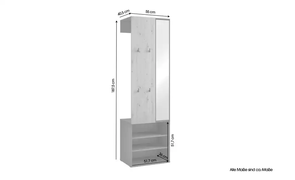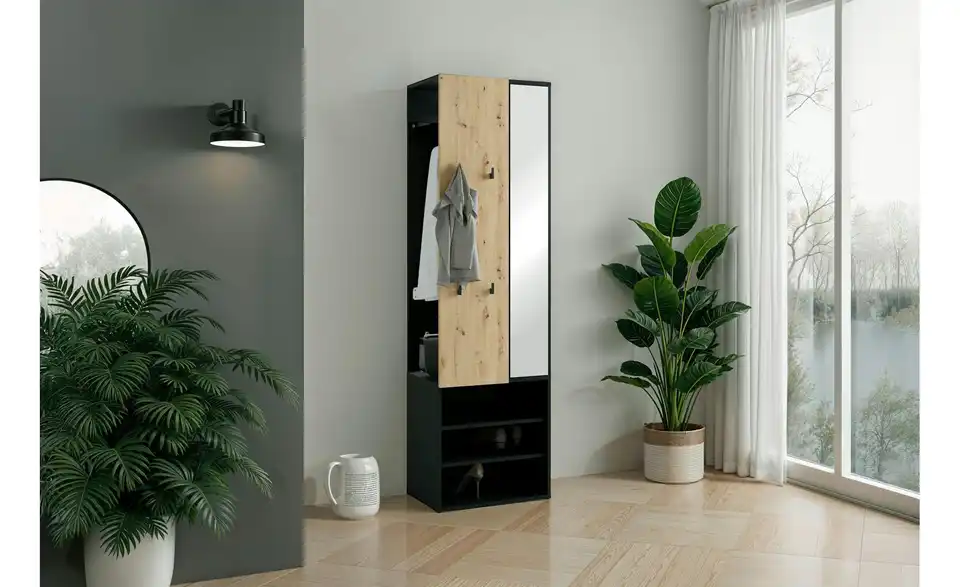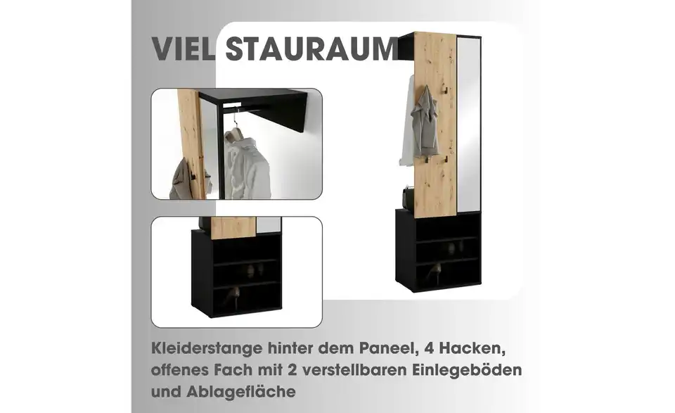 - Mehr zu Ausstattung / FunktionKleiderstange Metall schwarz, Haken Kunststoff schwarz, Spiegelglasstärke 3mm, Einlegeboden in 32mm-Abständen verstellbar, Fächer für max. 6 paar Schuhe geeignet
