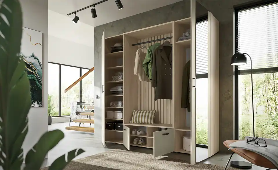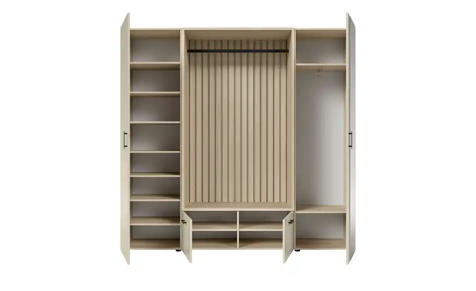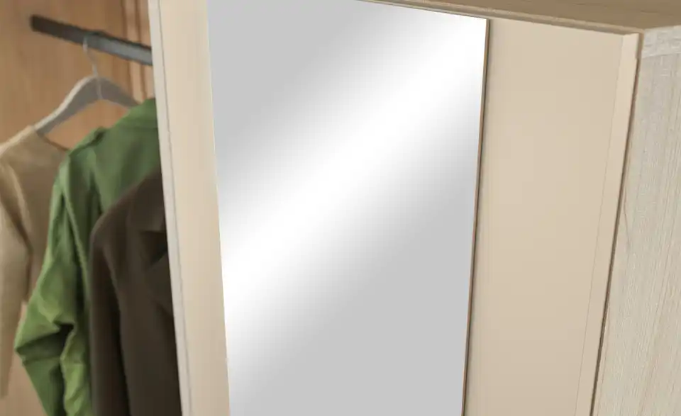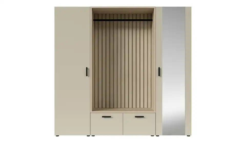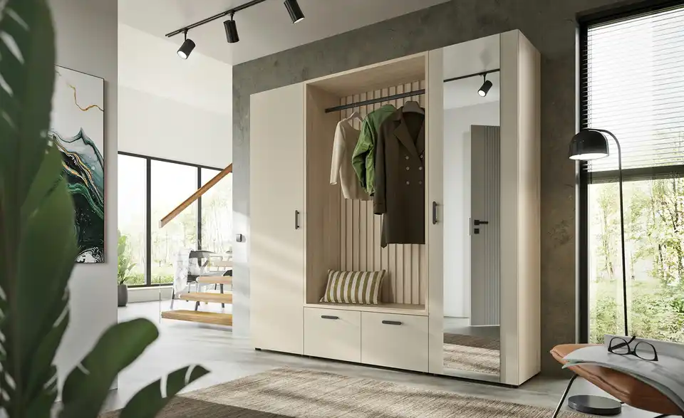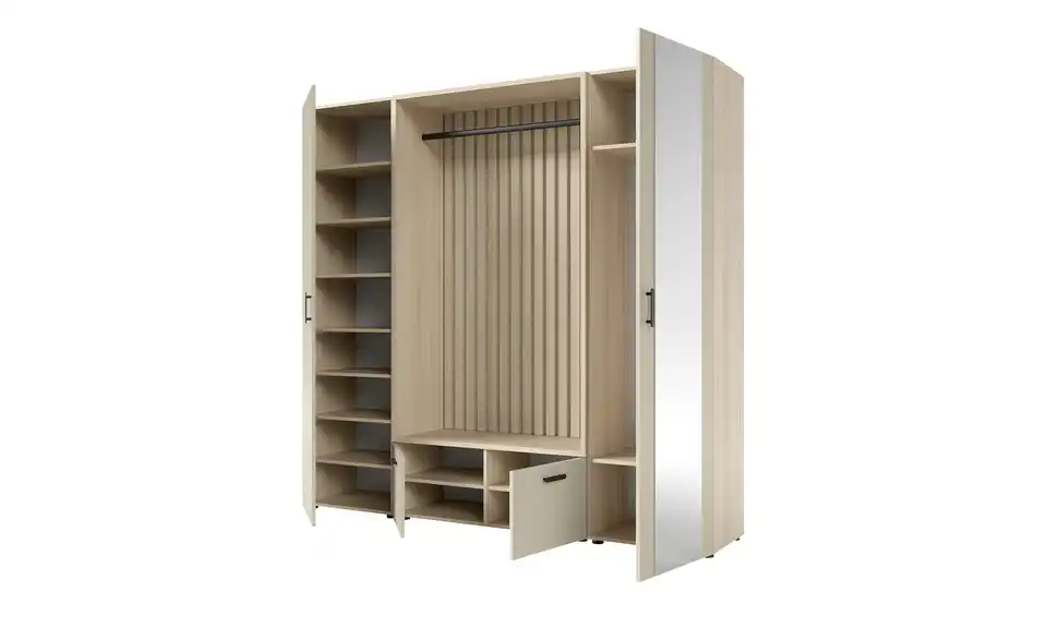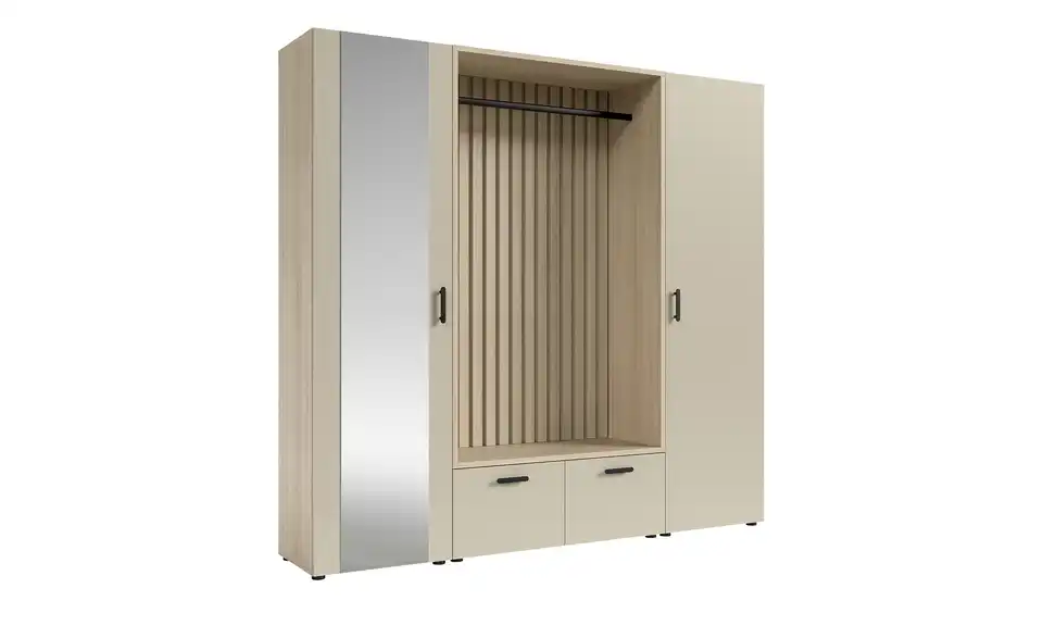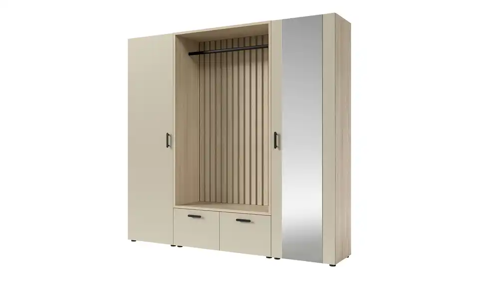 - Inklusive Spiegel, Paneel und zwei Garderobenschränke