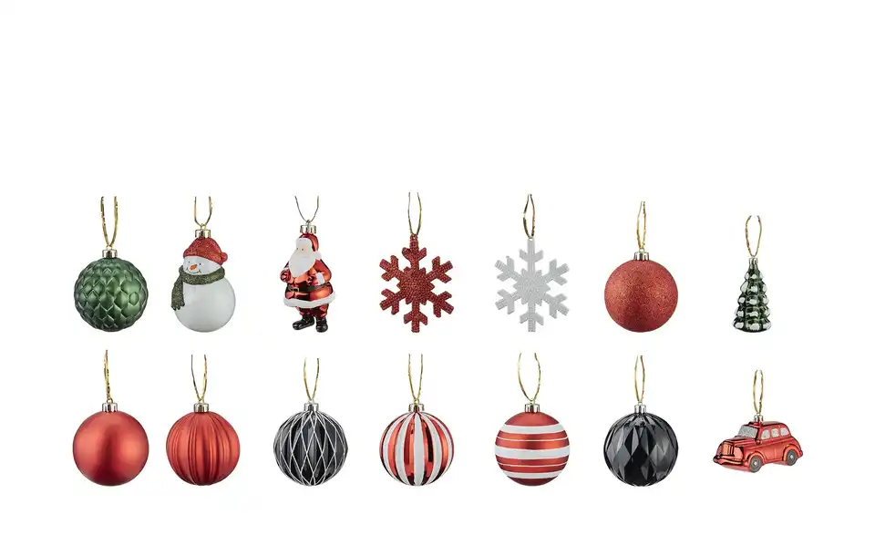 - Mehr zu Ausstattung / Funktionbestehend aus Weihnachtskugeln und Anhänger (Auto, Schneemann, Schneeflocken, Tanne, Weihnachtsmann)