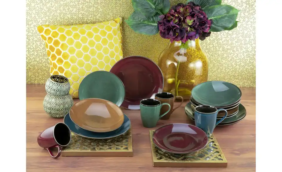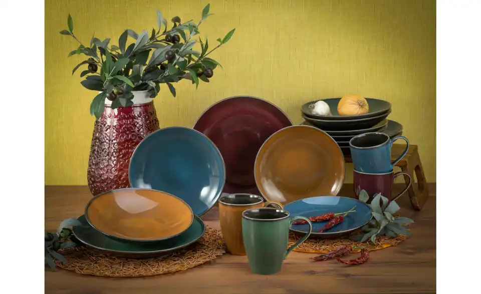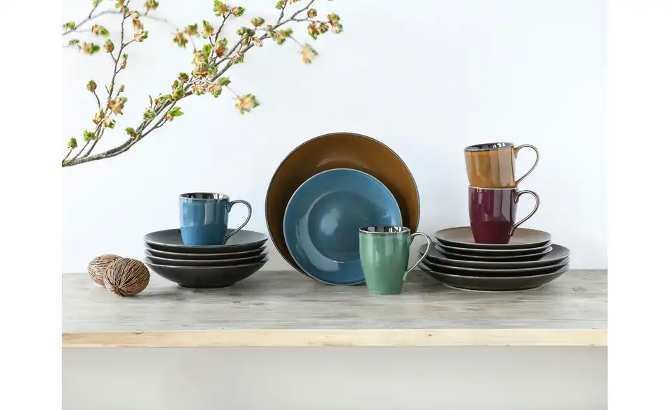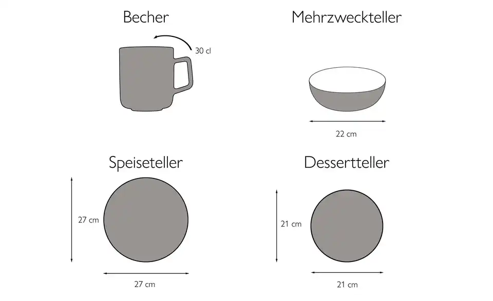 - Lieferumfang / mitgeliefertes Zubehör4 Speiseteller 27 cm 4 Dessertteller 21 cm 4 Kaffeebecher 30 cl 4 Mehrzweckteller tief 22 cm