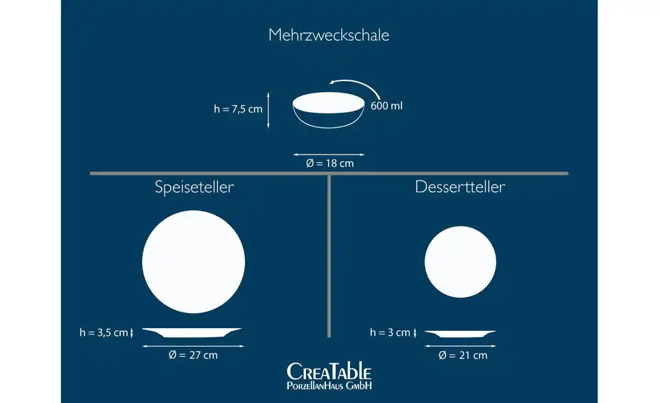 - Lieferumfang / mitgeliefertes Zubehör6 Speiseteller 27 cm 6 Dessertteller 21 cm 6 Mehrzweckschalen 18 cm