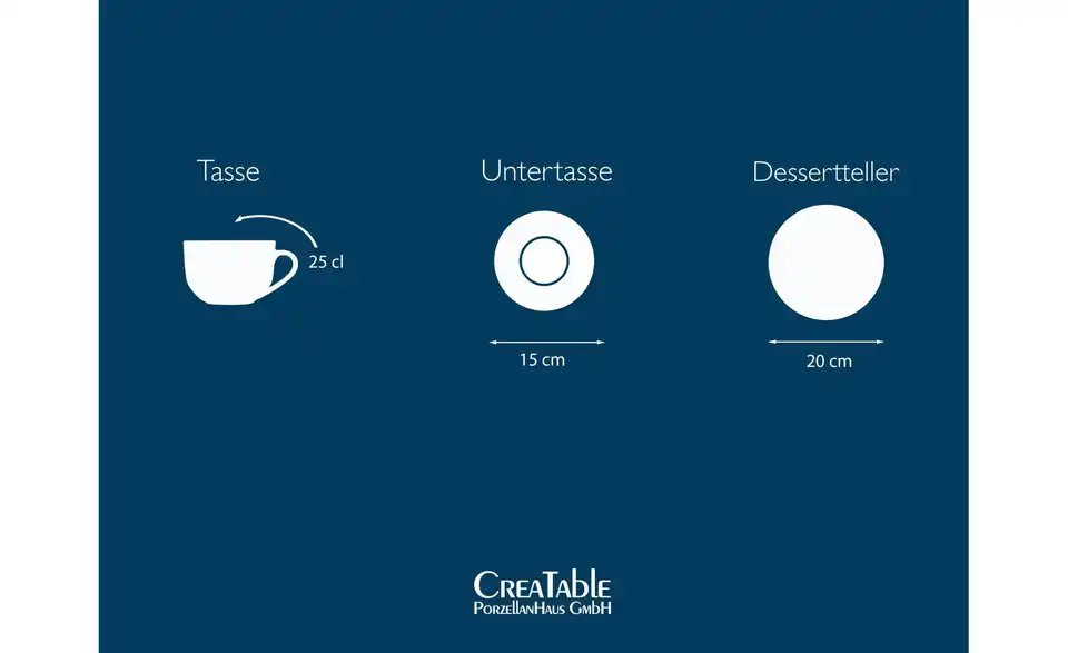 - Lieferumfang / mitgeliefertes Zubehör6 Desserteller 20 cm 6 Kaffeetesse 25 cl 6 Kaffeeuntere 15 cm
