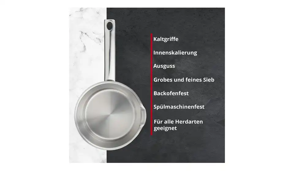 Kochen Sie wie ein Profi – mit Meisterkoch und der Serie KONUS. Sie besteht aus Bratentöpfen in drei Größen – mit 16 cm, 20 cm und 24 cm Durchmesser – und einer passenden Kasserole. Alle vier Modelle sind mit einer praktischen Innenskala ausgestattet. Die serienmäßige Ausgusslippe und das integrierte grobe und feine Sieb im Rand des Glasdeckels erleichtern das Aus- oder Abgießen des Topfinhaltes. Sogenannte Kaltgriffe sorgen dafür, dass Sie die Töpfe auch ohne Topflappen anfassen können. Ihr konisches Design macht die Serie auch optisch zum Highlight in der Küche.Lieferung & Versand