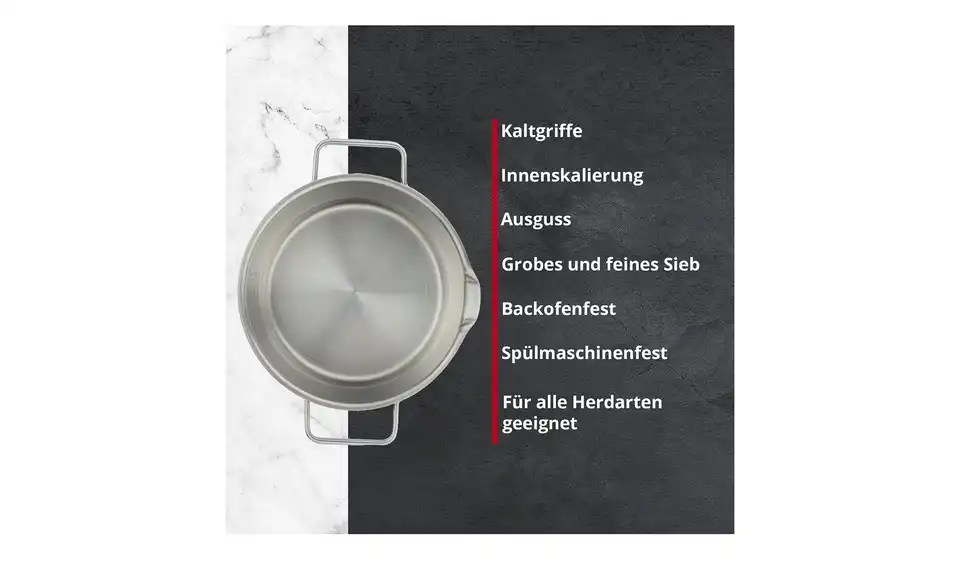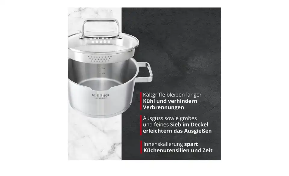 Kochen Sie wie ein Profi – mit Meisterkoch und der Serie KONUS. Sie besteht aus Bratentöpfen in drei Größen – mit 16 cm, 20 cm und 24 cm Durchmesser – und einer passenden Kasserole. Alle vier Modelle sind mit einer praktischen Innenskala ausgestattet. Die serienmäßige Ausgusslippe und das integrierte grobe und feine Sieb im Rand des Glasdeckels erleichtern das Aus- oder Abgießen des Topfinhaltes. Sogenannte Kaltgriffe sorgen dafür, dass Sie die Töpfe auch ohne Topflappen anfassen können. Ihr konisches Design macht die Serie auch optisch zum Highlight in der Küche.Lieferung & Versand