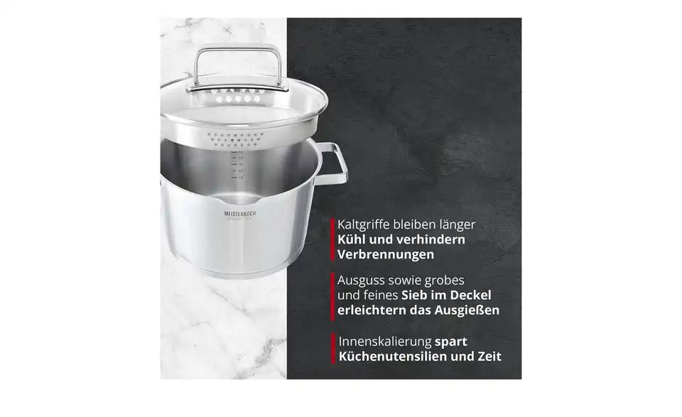 Kochen Sie wie ein Profi – mit Meisterkoch und der Serie KONUS. Sie besteht aus Bratentöpfen in drei Größen – mit 16 cm, 20 cm und 24 cm Durchmesser – und einer passenden Kasserole. Alle vier Modelle sind mit einer praktischen Innenskala ausgestattet. Die serienmäßige Ausgusslippe und das integrierte grobe und feine Sieb im Rand des Glasdeckels erleichtern das Aus- oder Abgießen des Topfinhaltes. Sogenannte Kaltgriffe sorgen dafür, dass Sie die Töpfe auch ohne Topflappen anfassen können. Ihr konisches Design macht die Serie auch optisch zum Highlight in der Küche.Lieferung & Versand