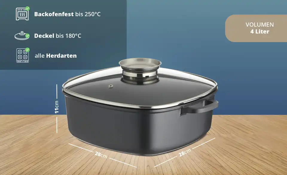 - Backofenfest bis 250°C (Deckel bis 180°C)