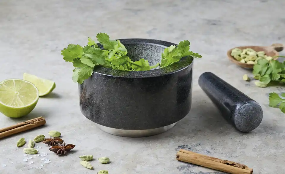 Der wunderschöner Mörser aus Granit mit Metallfuß begeistert nicht nur mit seiner Optik, sondern auch mit Standhaftigkeit. Kräuter und Gewürze lassen sich darin optimal zerkleinern.Lieferung & Versand