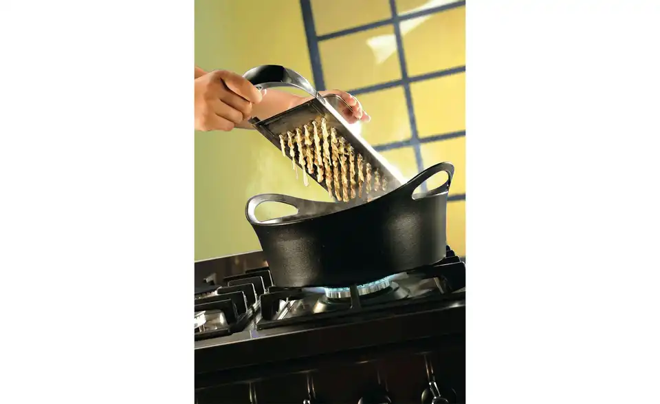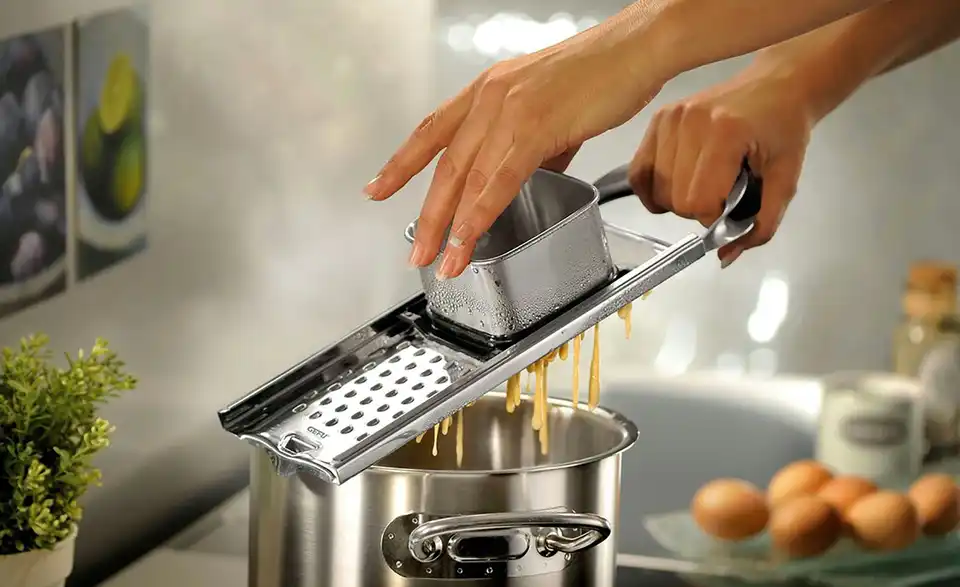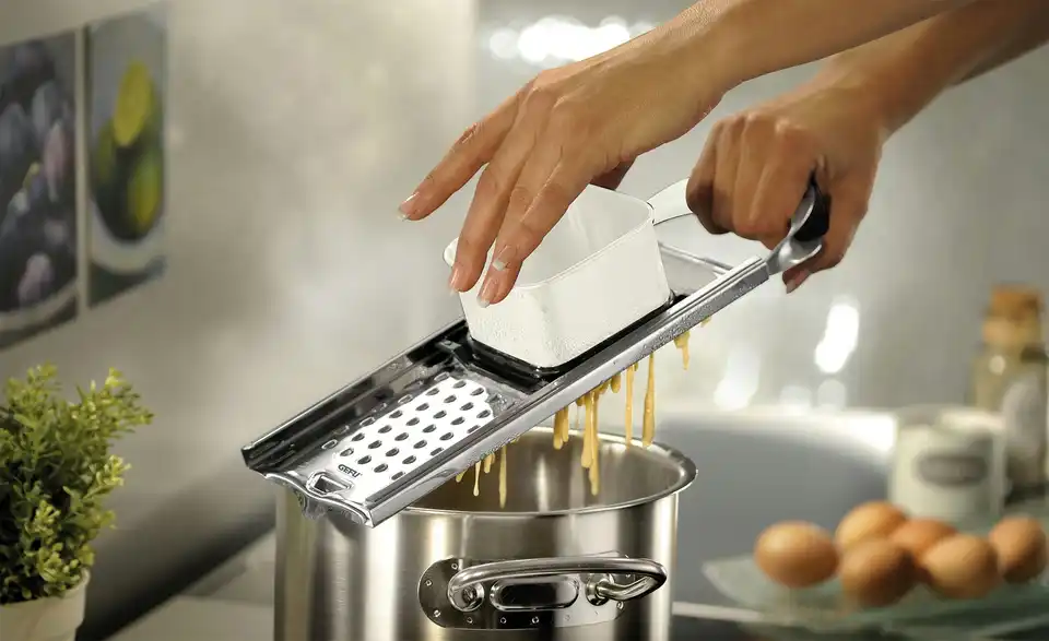 Für die mühelose und schnelle Herstellung von original Spätzle. Mit Teigschieber aus rostfreiem Edelstahl, poliert. Die Topfauflage verhindert das Abrutschen des Spätzlehobels und sorgt für einen sicheren Halt am Topfrand. Der neue ergonomische Edelstahlgriff liegt gut in der Hand. Zur Reinigung lässt sich der Kunststoffeinsatz im Griff entfernen.Lieferung & Versand