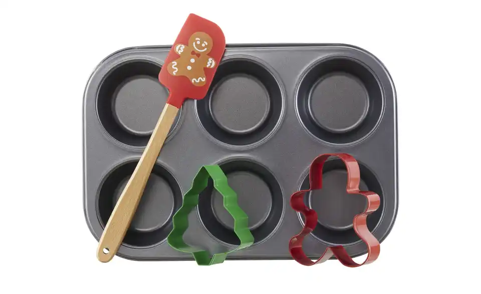 - Lieferumfang / mitgeliefertes Zubehör1x 6er Muffinform1x Miniteigschaber mit hübschem Motiv2 Keksausstecher, verschiedene Motive