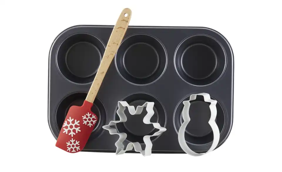 - Lieferumfang / mitgeliefertes Zubehör1x 6er Muffinform1x Miniteigschaber mit hübschem Motiv2 Keksausstecher, verschiedene Motive