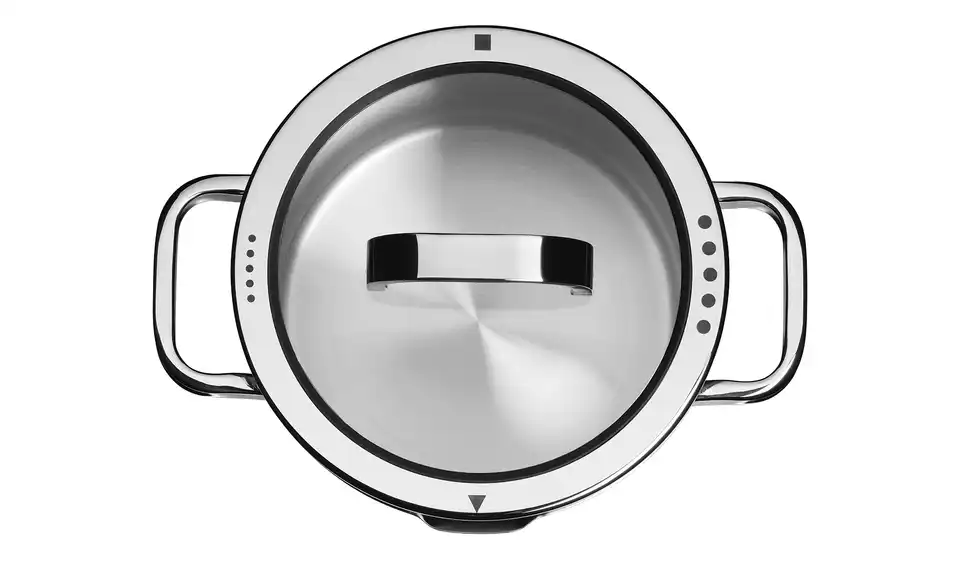 - 1 Deckel, 4 Funktionen - 4 Positionen für 4 Funktionen: geschlossen für wasserarmes Garen, offen für volles Abgießen, mit großer bzw. kleiner Sieböffnung zum Abgießen von Nudeln oder Reis.