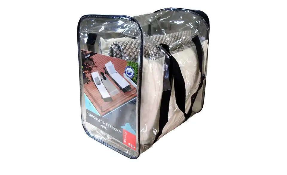 - Lieferumfang / mitgeliefertes Zubehörgefalteter Teppich mit passenden Outdoorkissen (40 x 40cm) in einer Vinyltasche