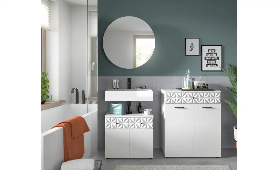 - Bestehend aus1 Waschbeckenunterschrank (60x54x37 cm), 1 Bad-Spiegelschrank rund (70x70x18 cm), 1 Standschrank breit (70x85x34 cm)