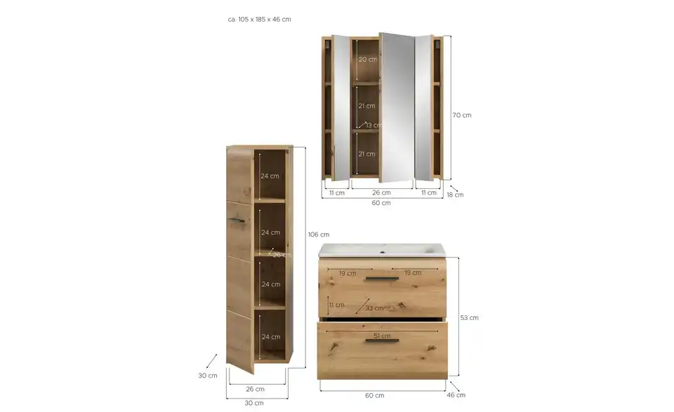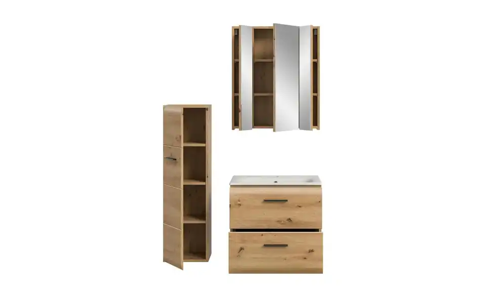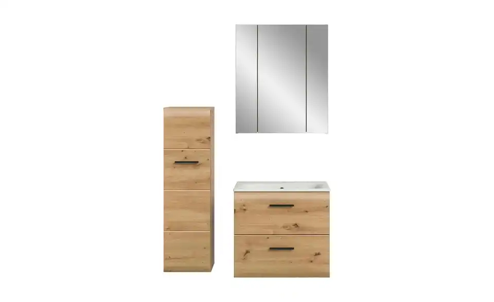 - Bestehend aus1x Stauraumtype, 1x Waschtisch inkl. Waschbecken, 1x Spiegelschrank