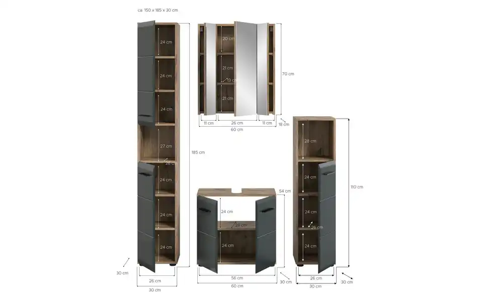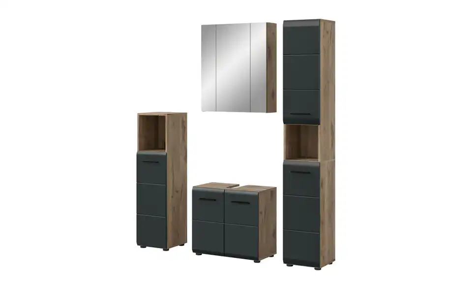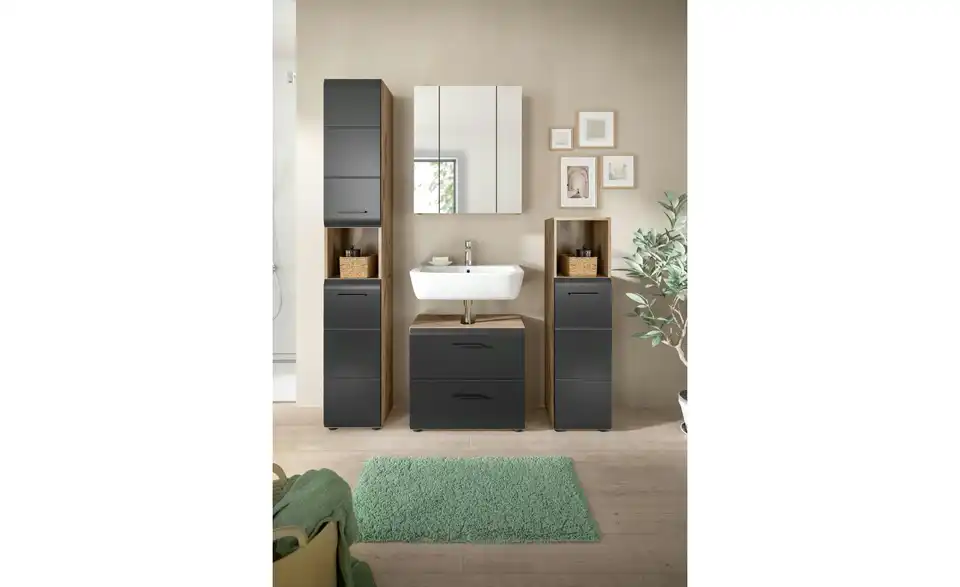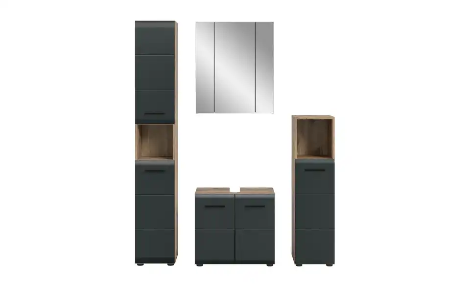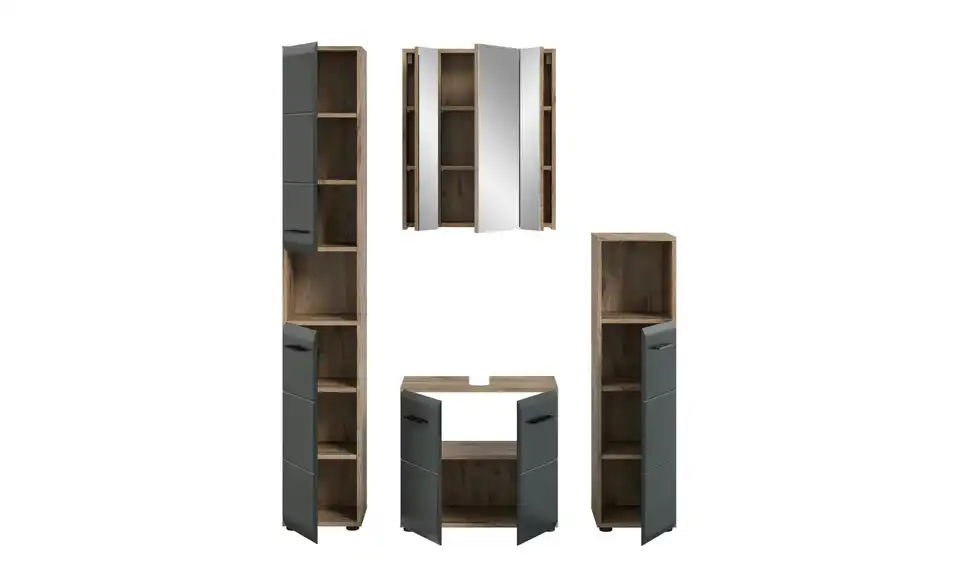- Bestehend aus1x Hochschrank, 1x WBU, 1x Spiegelschrank, 1x Standschrank hoch