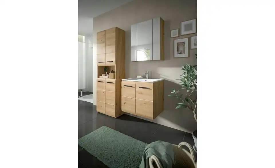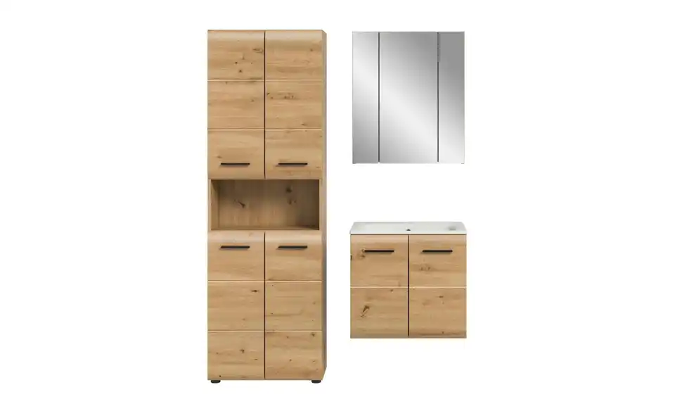 - Bestehend aus1x Hochschrank breit, 1x Waschtisch inkl. Waschbecken, 1x Spiegelschrank
