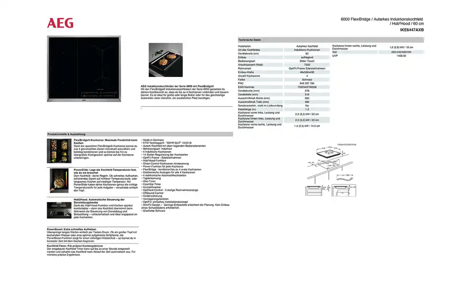 - Mehr zu Ausstattung / Funktion4 Kochzonen14 Heizstufen KochfelderSlimFit-Design - geringe Einbautiefe (kein Einbau eines Schutzbodens erforderlich)OptiFit Frame (Edelstahlrahmen)OptiFix - einfaches InstallationskonzeptETM Testmagazin "SEHR GUT" 10/2018Direct-Control Kochzonen-AnsteuerungPower-Funktion für jede KochzoneOptiHeat Control (3-stufige Restwärmeanzeige)FlexiBridge (kombiniert bis zu 4 ovale Kochzonen),4 Induktions-Kochzonen14 Stufen Regulierung der KochstellenÖko-TimerCountUp-TimerKurzzeitweckerOffSound ControlTopferkennungVerrieglungsfunktion