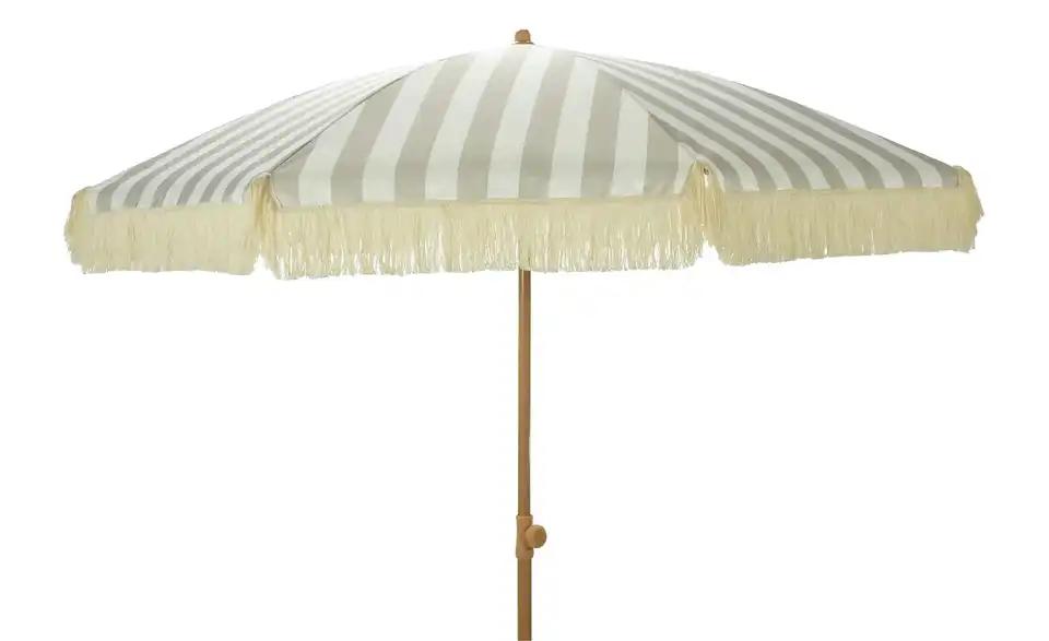 - Mehr zu FarbeSchirm taupe weiß gestreiftStahlstange mit holzähnlicher Beschichtung