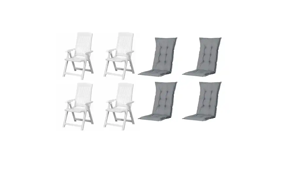 - Lieferumfang / mitgeliefertes Zubehör4 x Klappsessel weiß, 4 x Auflage grau