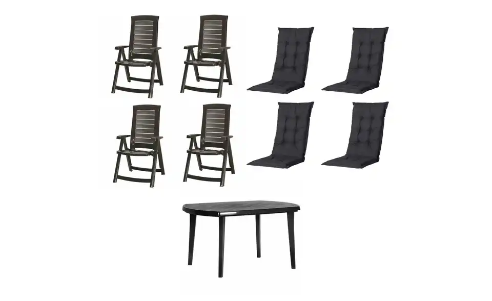 - Lieferumfang / mitgeliefertes Zubehör4 x Klappsessel graphit, 1 x Tisch graphit, 4 x Auflage black