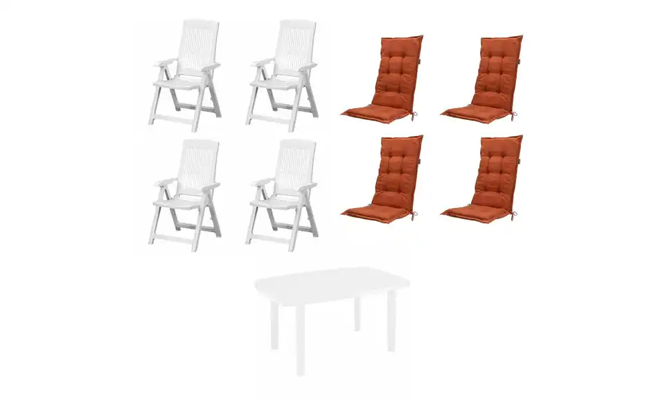 - Lieferumfang / mitgeliefertes Zubehör4 x Klappsessel weiß, 1 x Tisch weiß, 4 x Auflage terra