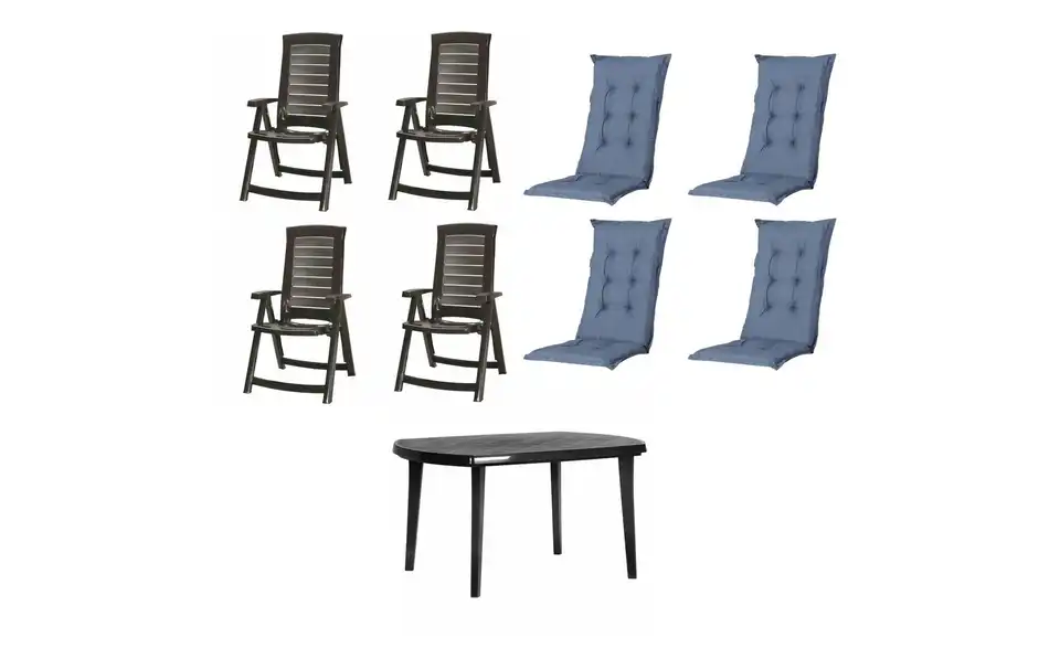 - Lieferumfang / mitgeliefertes Zubehör4 x Klappsessel graphit, 1 x Tisch graphit, 4 x Auflage kobalt