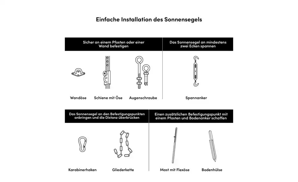 - Mehr zu Ausstattung / Funktiondank der offenen Gewebe-Struktur, kann das Sonnensegel die ganze Saison draußen bleiben (März bis September) und selbst bei starkem Wind aufgespannt bleiben