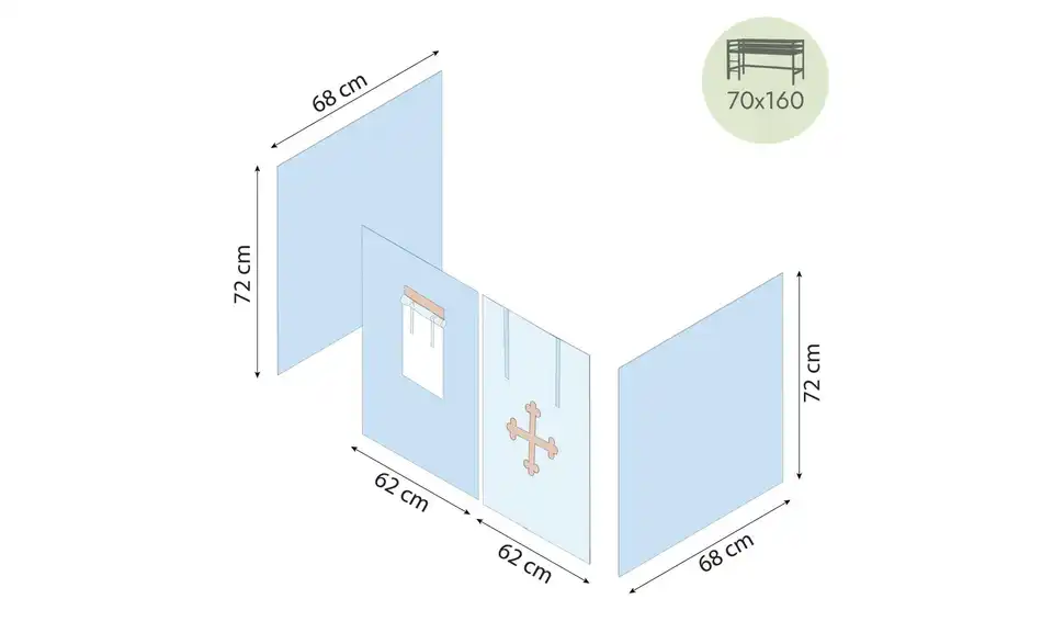 - Lieferumfang / mitgeliefertes ZubehörVorhang für die Seiten und die Front des Kinderbetts mit Aufhängung - für Kinderbetten mit Liegefläche 70x160 und Höhe unter dem Bett ca. 70 cm