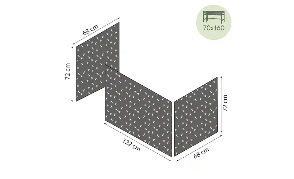 - Für Kinderbetten mit Liegefläche 70x160 und Höhe unter dem Bett ca. 70 cm