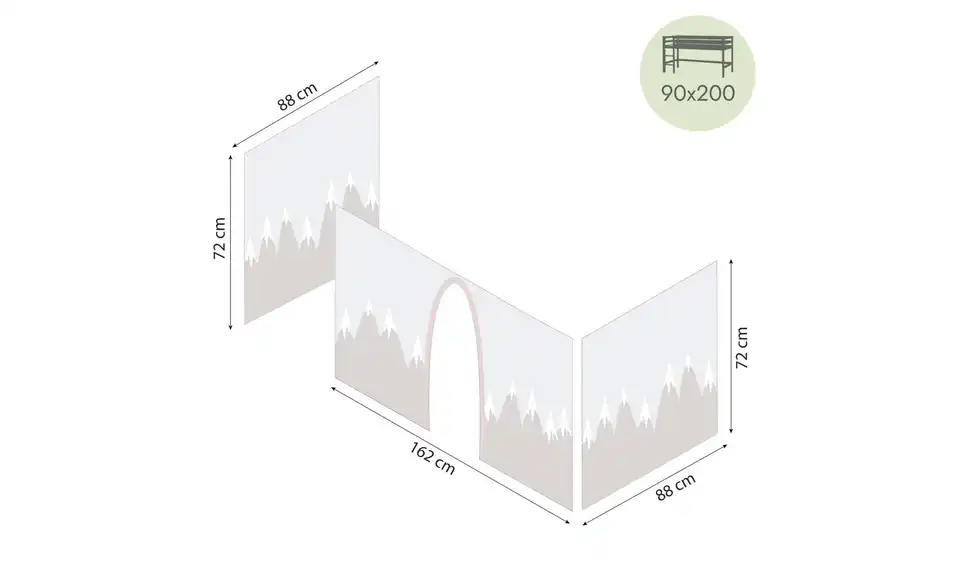 - Lieferumfang / mitgeliefertes ZubehörVorhang für die Seiten und die Front des Kinderbetts mit Aufhängung - für Kinderbetten mit Liegefläche 90x200 und Höhe unter dem Bett ca. 70 cm