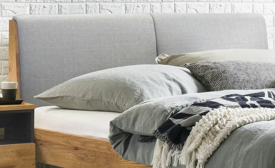 - Mehr zu FarbeBettgestell aus Wildeiche natur, geöltBezug Polsterkopfteil Pepe grey