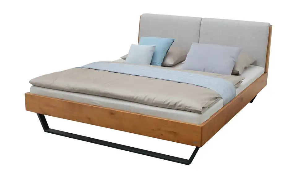 - Mehr zu FarbeBettgestell aus Wildeiche natur, geöltBezug Polsterkopfteil Pepe grey