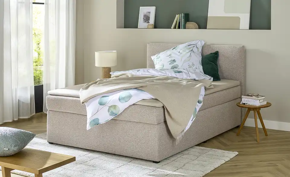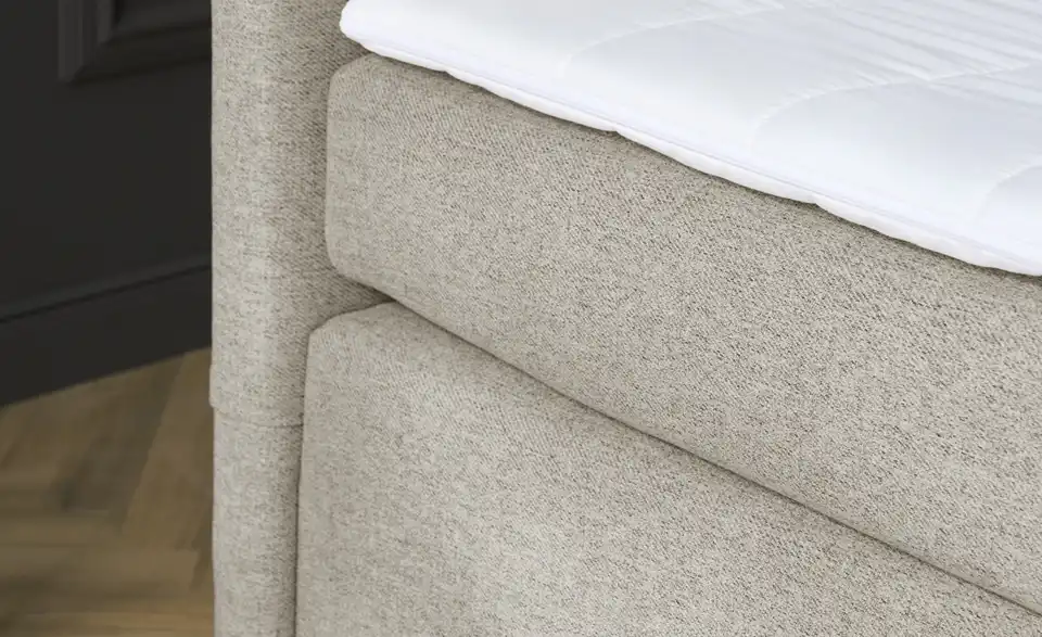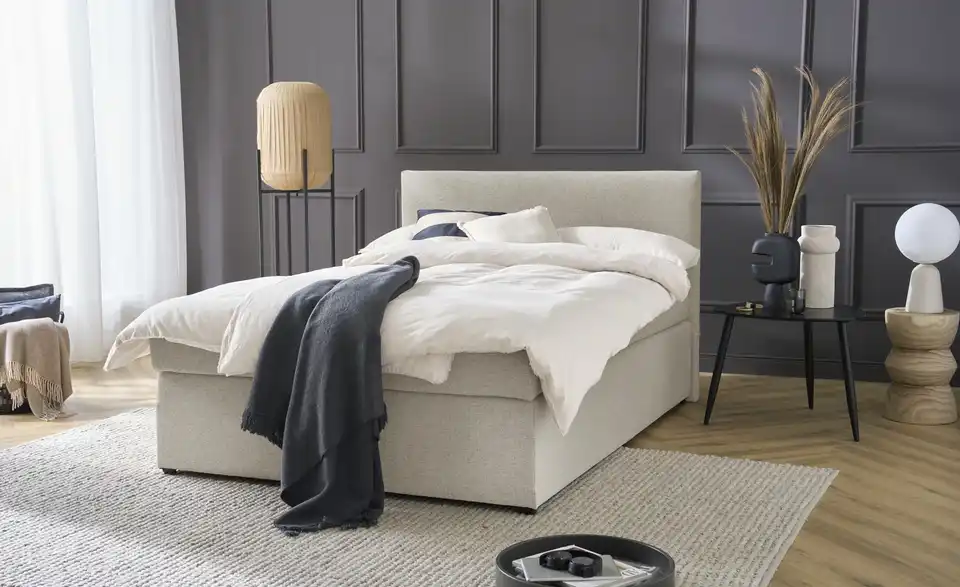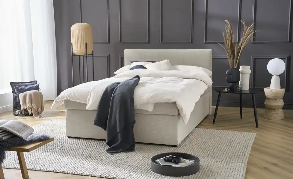 Das Boxspringbett Duke ist eine bequeme Grundlage für erholsame Nächte. Box und Matratze sind mit flächenelastischen Bonellfederkernen ausgestattet. Darauf liegt der drei Zentimeter dicke Topper mit Schaumstoffkern. Der Härtegrad der Matratze ist in H3 angegeben und damit weder zu weich, noch zu fest. Duke hat ein halbhohes, gepolstertes Kopfteil, an das Sie sich beim Lesen anlehnen können. Für den Bezug ist ein unempfindliches Flachgewebe verwendet worden, der sich gut kombinieren lässt.Lieferung & Versand