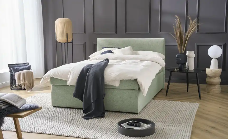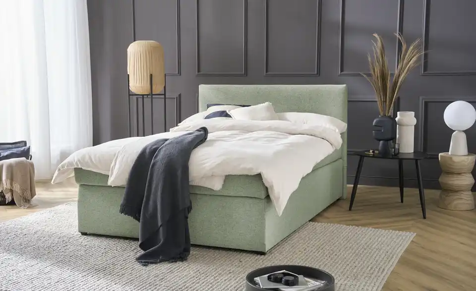 Das Boxspringbett Duke ist eine bequeme Grundlage für erholsame Nächte. Box und Matratze sind mit flächenelastischen Bonellfederkernen ausgestattet. Darauf liegt der drei Zentimeter dicke Topper mit Schaumstoffkern. Der Härtegrad der Matratze ist in H3 angegeben und damit weder zu weich, noch zu fest. Duke hat ein halbhohes, gepolstertes Kopfteil, an das Sie sich beim Lesen anlehnen können. Für den Bezug ist ein unempfindliches Flachgewebe verwendet worden, der sich gut kombinieren lässt.Lieferung & Versand