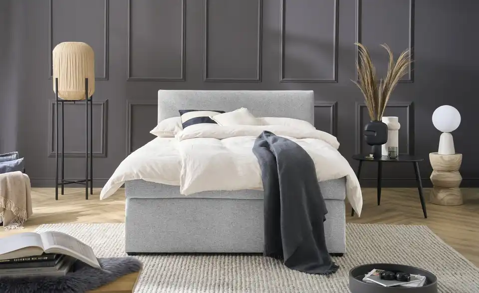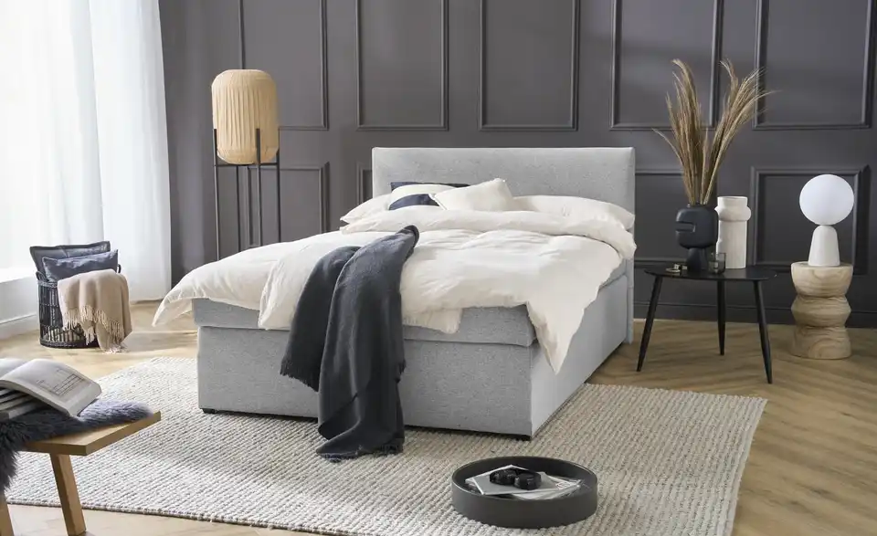 Das Boxspringbett Duke ist eine bequeme Grundlage für erholsame Nächte. Box und Matratze sind mit flächenelastischen Bonellfederkernen ausgestattet. Darauf liegt der drei Zentimeter dicke Topper mit Schaumstoffkern. Der Härtegrad der Matratze ist in H3 angegeben und damit weder zu weich, noch zu fest. Duke hat ein halbhohes, gepolstertes Kopfteil, an das Sie sich beim Lesen anlehnen können. Für den Bezug ist ein unempfindliches Flachgewebe verwendet worden, der sich gut kombinieren lässt.Lieferung & Versand
