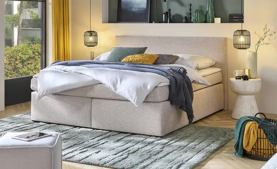 Das Boxspringbett Duke ist eine bequeme Grundlage für erholsame Nächte. Box und Matratze sind mit flächenelastischen Bonellfederkernen ausgestattet. Darauf liegt der drei Zentimeter dicke Topper mit Schaumstoffkern. Der Härtegrad der Matratze ist in H3 angegeben und damit weder zu weich, noch zu fest. Duke hat ein halbhohes, gepolstertes Kopfteil, an das Sie sich beim Lesen anlehnen können. Für den Bezug ist ein unempfindliches Flachgewebe verwendet worden, der sich gut kombinieren lässt.Lieferung & Versand