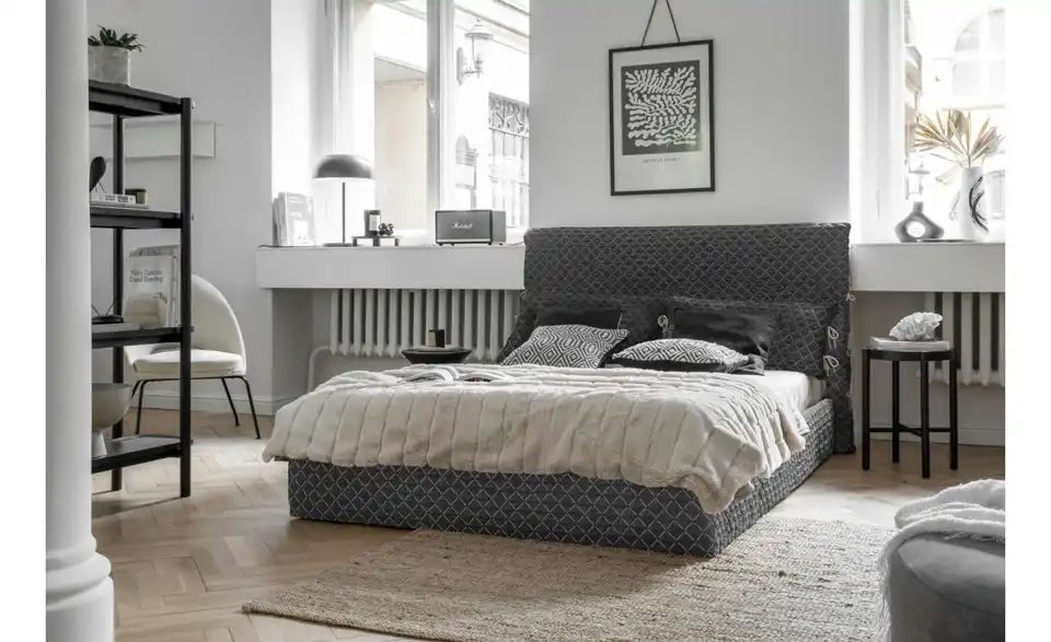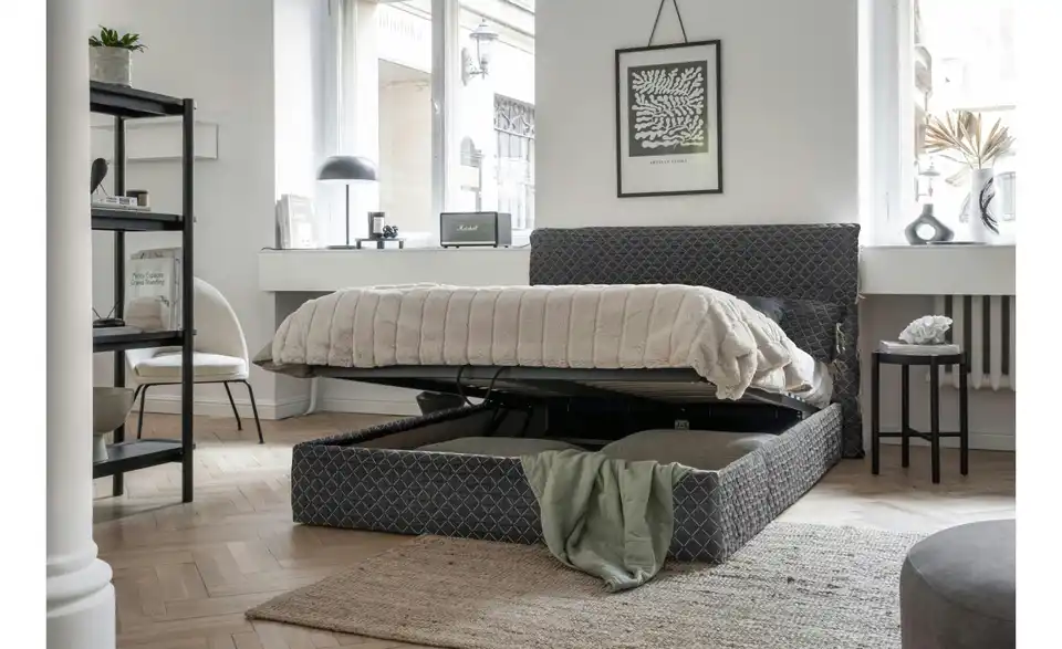 - Ausstattung / FunktionKopfteil rundherum bezogenBettkasten mit Belüftung