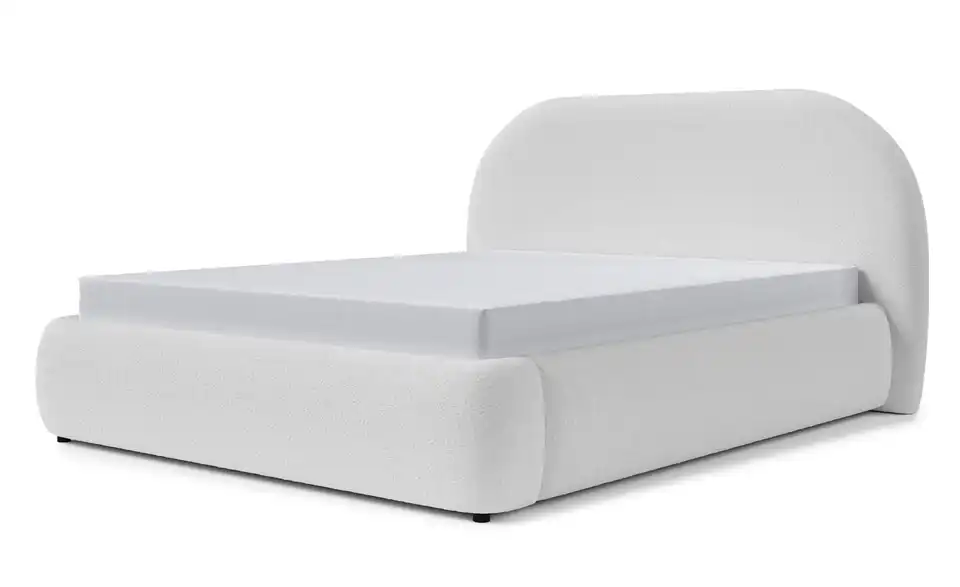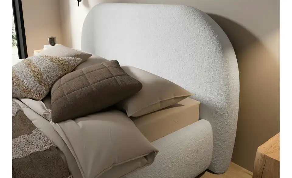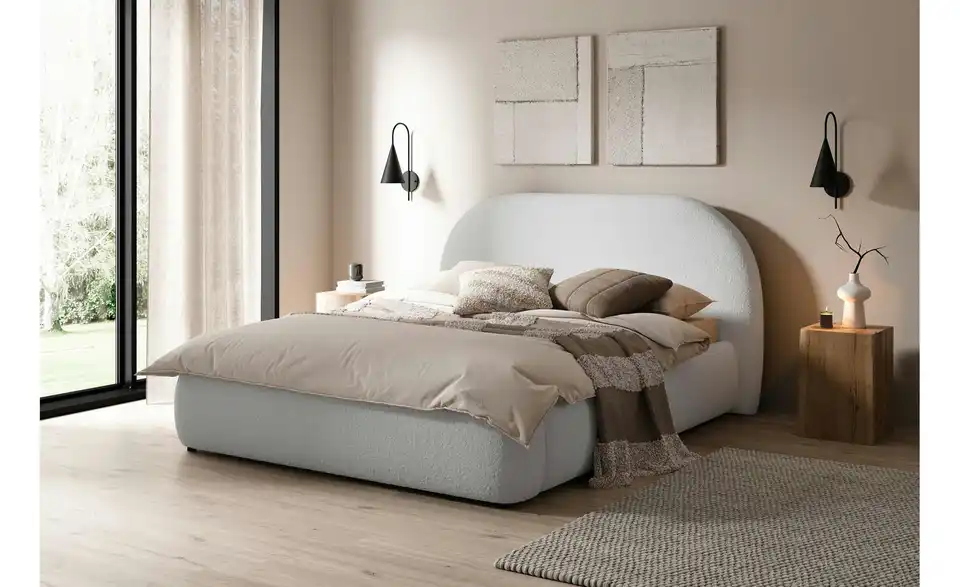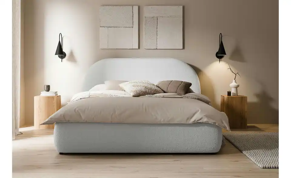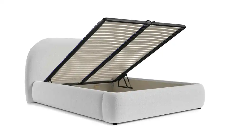 Sind Sie auf der Suche nach modernen Formen und einem Hauch von Exklusivität für Ihr Zuhause? Das Polsterbett Ovo kombiniert außergewöhnliches Design, maximalen Komfort und praktische Funktionalität – eine perfekte Wahl für jedes Schlafzimmer. Mit seinem markanten, abgerundeten Kopfteil und dem eleganten Rahmen zieht Ovo die Blicke auf sich. Der attraktive Bezugsstoff verbindet eine zeitlose Optik mit einer angenehmen Haptik. Der hochwertige Stoff sorgt nicht nur für ein stilvolles Erscheinungsbild, sondern bietet auch gemütlichen Komfort – ob für einen entspannten Abend mit einem Buch oder ein langes Frühstück im Bett. Der stabile Bettrahmen aus einer Kombination von Holz, Möbelplatten und HDF-Platten bietet Langlebigkeit und Sicherheit. Der Metall-Lattenrost mit Gasdruckfedern lässt sich mühelos nach oben öffnen und gibt den Blick auf einen geräumigen Bettkasten frei. Dieser bietet ausreichend Stauraum für Bettwäsche, Decken und andere Utensilien, getrennt durch eine praktische Mittelwand.Lieferung & Versand