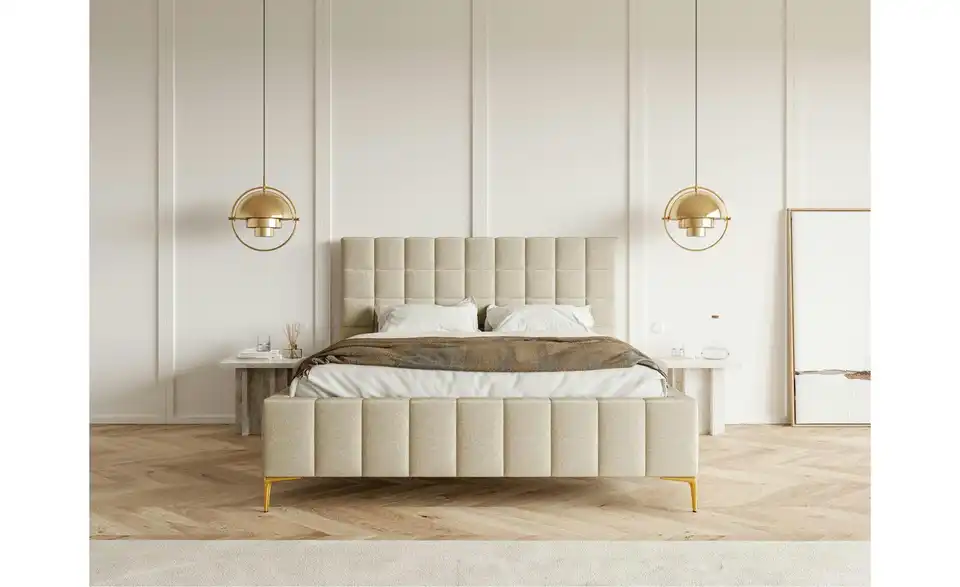 Das Polsterbett Szejlo vereint Stil, Komfort und praktische Funktionen. Mit seinem edlen Design, geprägt von rechteckigen Steppungen am weichen Kopfteil und Bettrahmen, bringt das Doppelbett Szejlo Eleganz in Ihr Schlafzimmer. Die 15 cm hohen, goldfarbenen Füße verleihen dem Bett eine leichte und schwebende Optik, während der robuste Bezug aus Chenille-Stoff mit seiner geflochtenen Struktur langlebig, lichtbeständig und abriebfest ist. Das Bett bietet nicht nur Design, sondern auch Funktionalität: Der geräumige Bettkasten ermöglicht eine aufgeräumte Aufbewahrung von Bettwäsche, Decken und mehr. Dank der Gasdruckfedern lässt sich der Metall-Lattenrost mühelos anheben, sodass der Stauraum leicht zugänglich ist. Mit Szejlo holen Sie sich modernes Design und hohen Komfort in Ihr Schlafzimmer – perfekt für ein glamouröses Ambiente.Lieferung & Versand