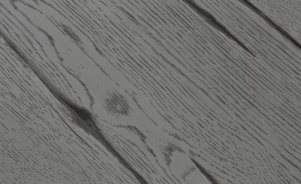 - Mehr zu MaterialTischplatte und Gestell aus Zerreiche mit Gebrauchsspuren in Eiche Grau lackiert