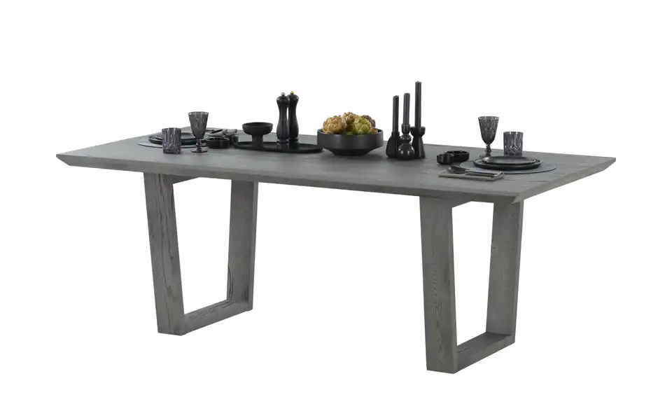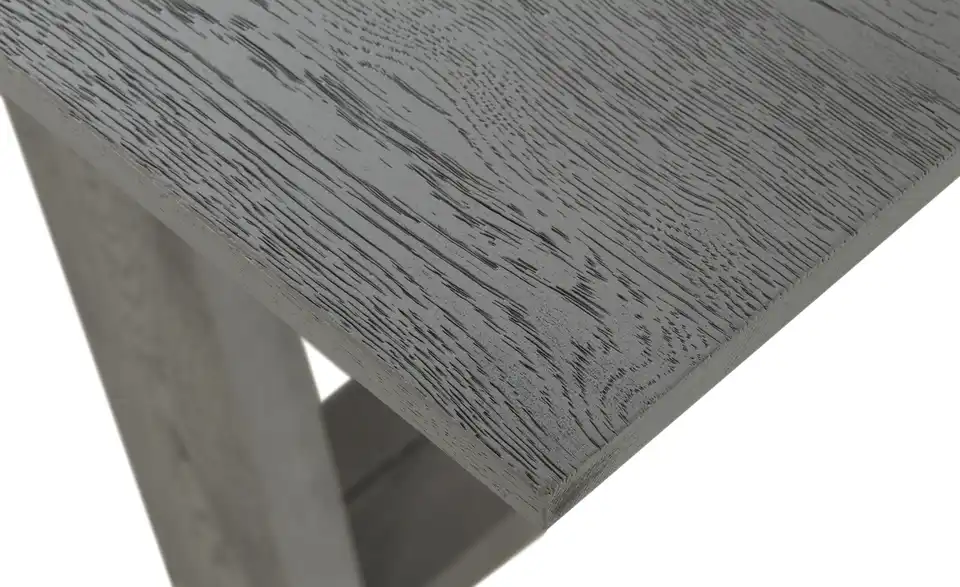 - Mehr zu MaterialTischplatte und Gestell aus Zerreiche mit Gebrauchsspuren in Eiche Grau lackiert