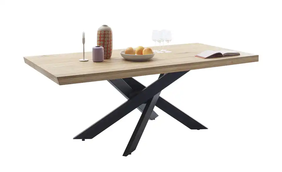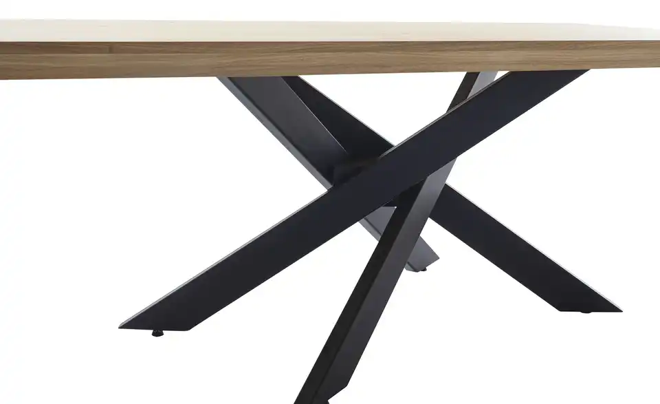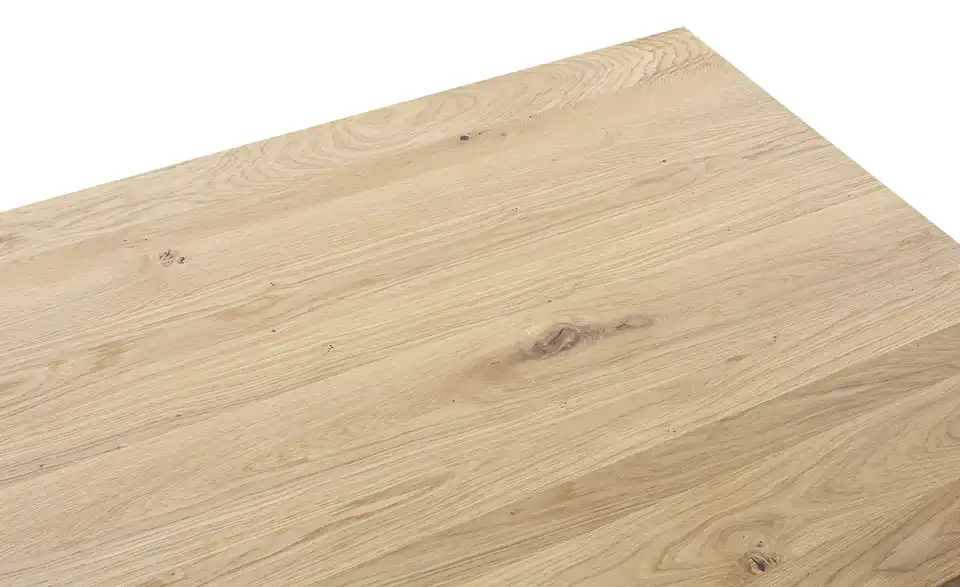 - Mehr zu MaterialTischplatte aus Massivholz in Wildeiche geölt mit durchgehender LamelleGestell Metall Schwarz pulverbeschichtet