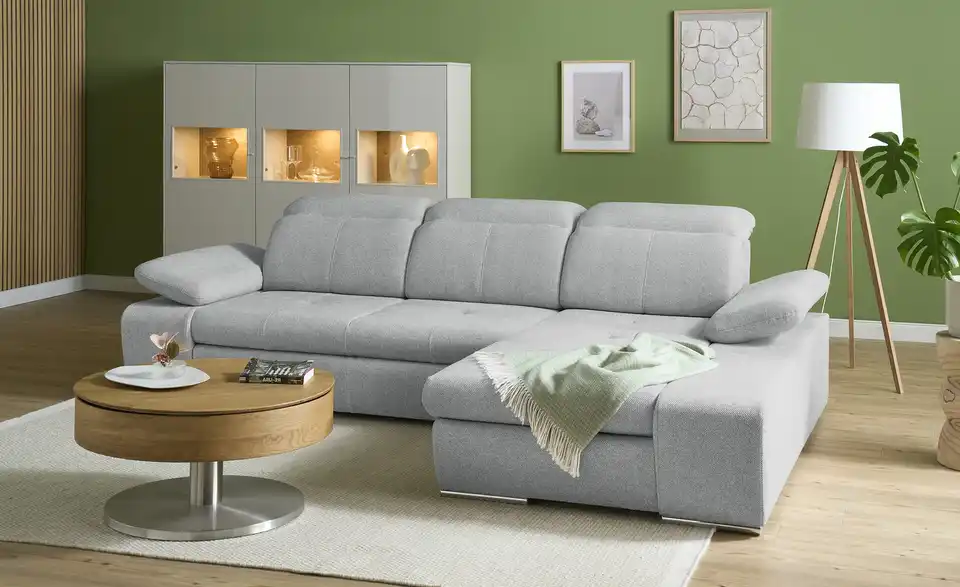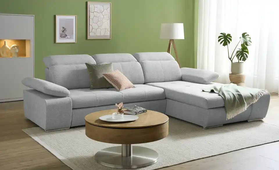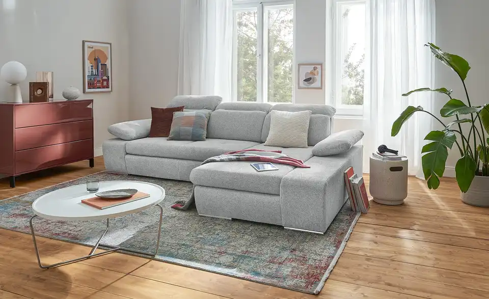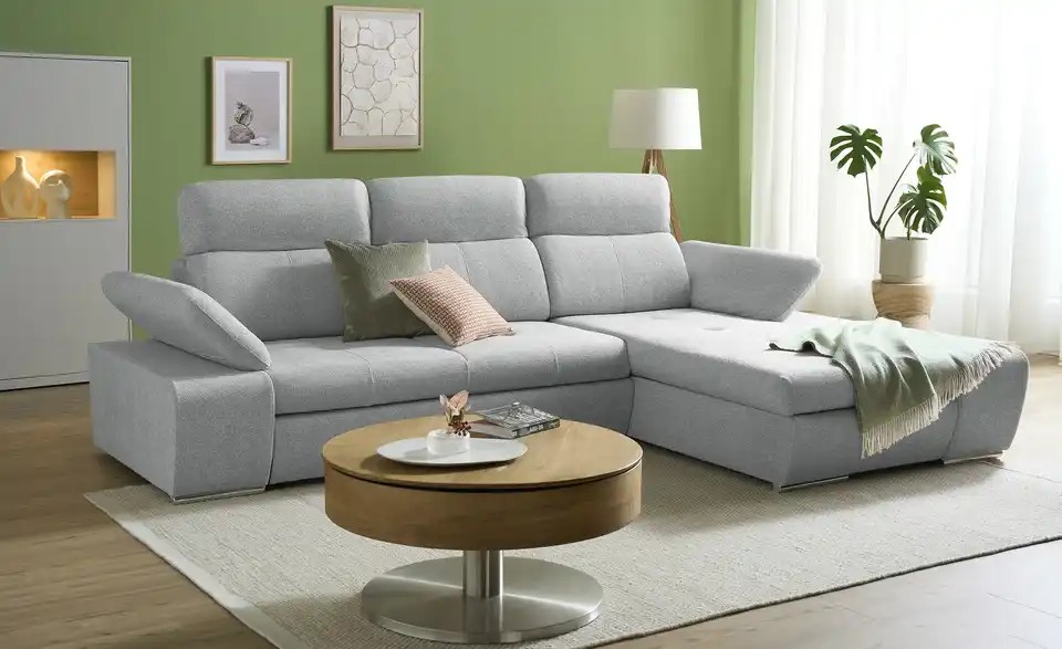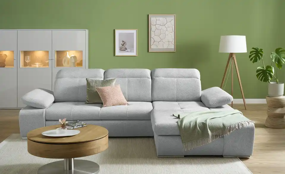 Mit dem Ecksofa Avilla schaffen Sie sich ganz leicht Ihre eigene Wohlfühl-Oase. Dicke Polster und einladende Arm- und Rückenlehnen sorgen für den nötigen Komfort. Verstellen Sie die Kopfteile und klappen Sie die Armlehnen kinderleicht hoch: Avilla passt sich Ihren Bedürfnissen problemlos an. Die gesamte Couch ist mit einem edlen, weichen Mikrofaserstoff in Veloursoptik bezogen und besitzt chromfarbene Füße, die einen attraktiven Kontrast setzten. Übrigens: Wählen Sie die erweiterte Funktion, wenn Sie häufiger Übernachtungsgäste empfangen. Avilla ist dann zusätzlich mit einem geräumigen Bettkasten und einer praktischen Schlaffunktion ausgestattet.bewusst wohnen