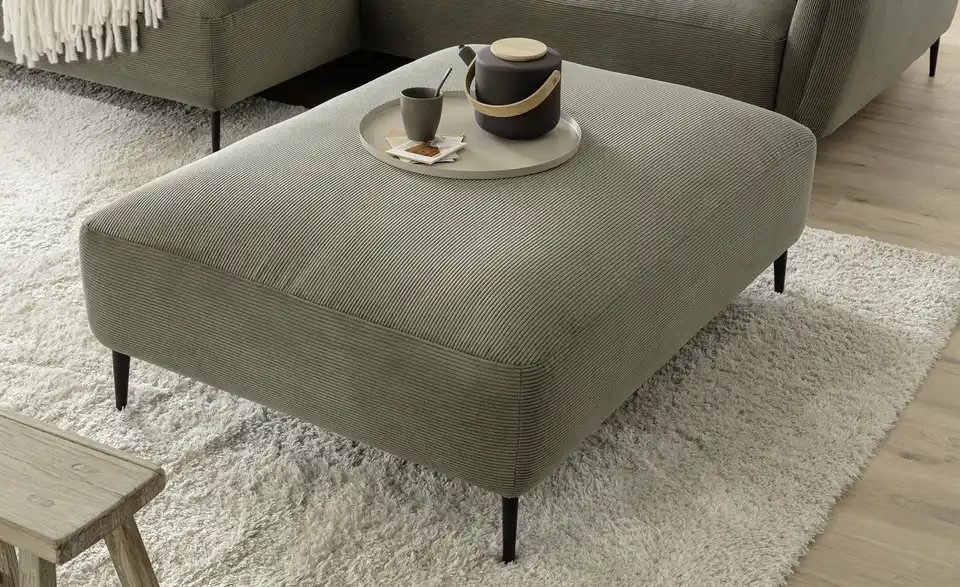 Dieser Markenhocker fügt sich sanft in Ihr Wohnzimmer ein. Wie für die Marke Jette Home üblich, werden Design und Komfort gekonnt miteinander verbunden. Passend zum gleichnamigen Ecksofa, besitzt auch dieser Hocker den trendigen Cordstoff und die schwarzen Metallfüße. Ob als trendiges it-Piece oder zusammen mit dem Marken-Ecksofa: Der Hocker findet in nahezu jedem Raum einen Platz.bewusst wohnen