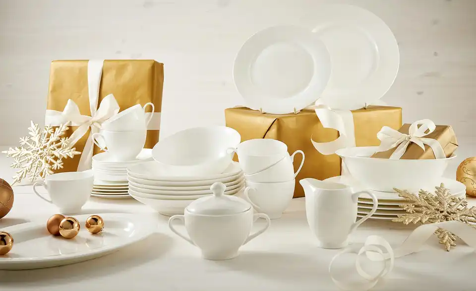 Mit diesem 35-teiligen weißen Kombiservice erwerben Sie einen ganz besonderen Blickfang für Ihre Tafel. Aus feinstem lichtdurchlässigen Bone China Porzellan gefertigt ist jedes einzelne Stück ein dekoratives Accessoire für sich. Sie erhalten das Service in einer attraktiven Geschenkverpackung.Lieferung & Versand