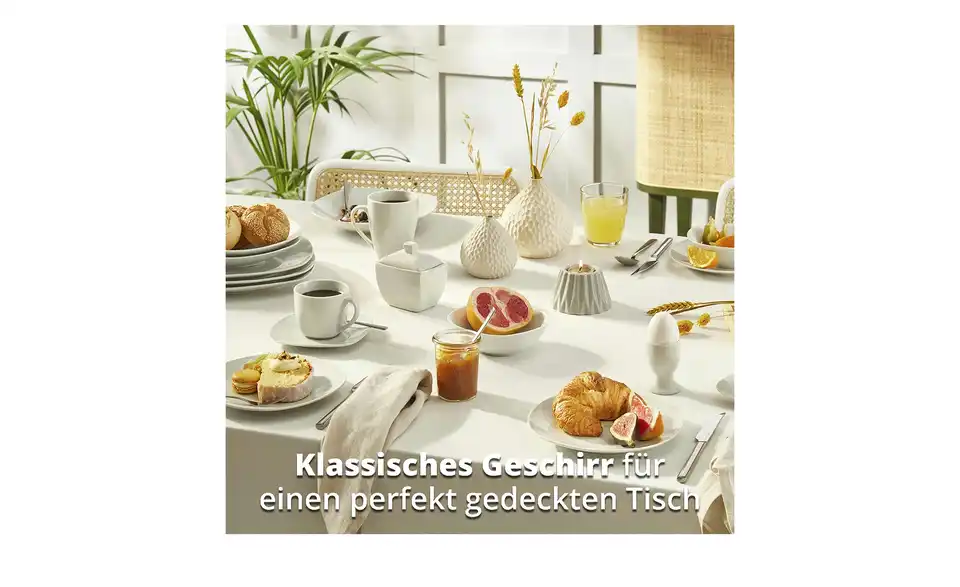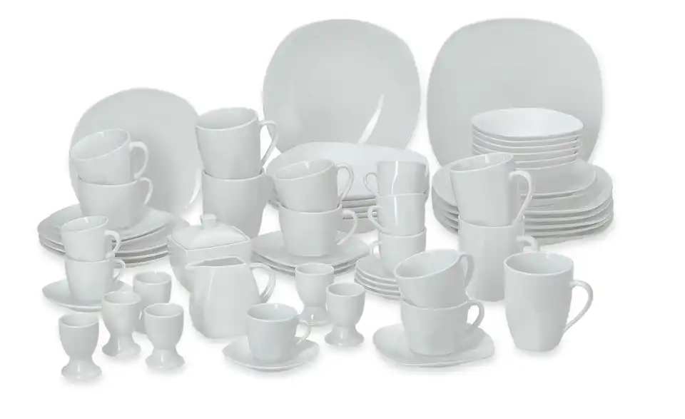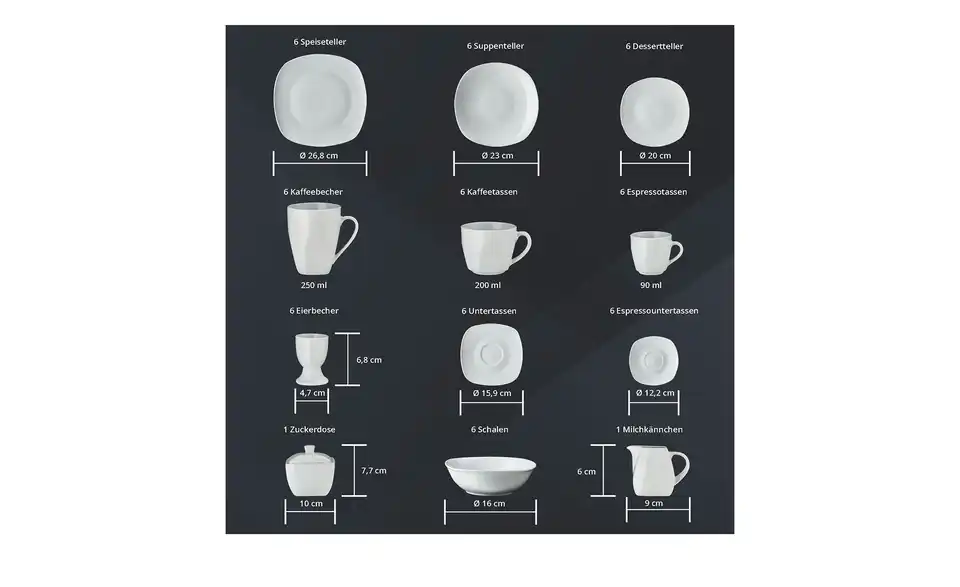 - Lieferumfang / mitgeliefertes Zubehör6x Kaffeetasse6x Untertasse6x Dessertteller6x Teller tief6x Teller flach6x Schalen (16 cm Durchmesser)6x Kaffeebecher6x Espressotasse6x Espresso-Untertasse6x Eierbecher1x Zuckerdose1x Milchkännchen
